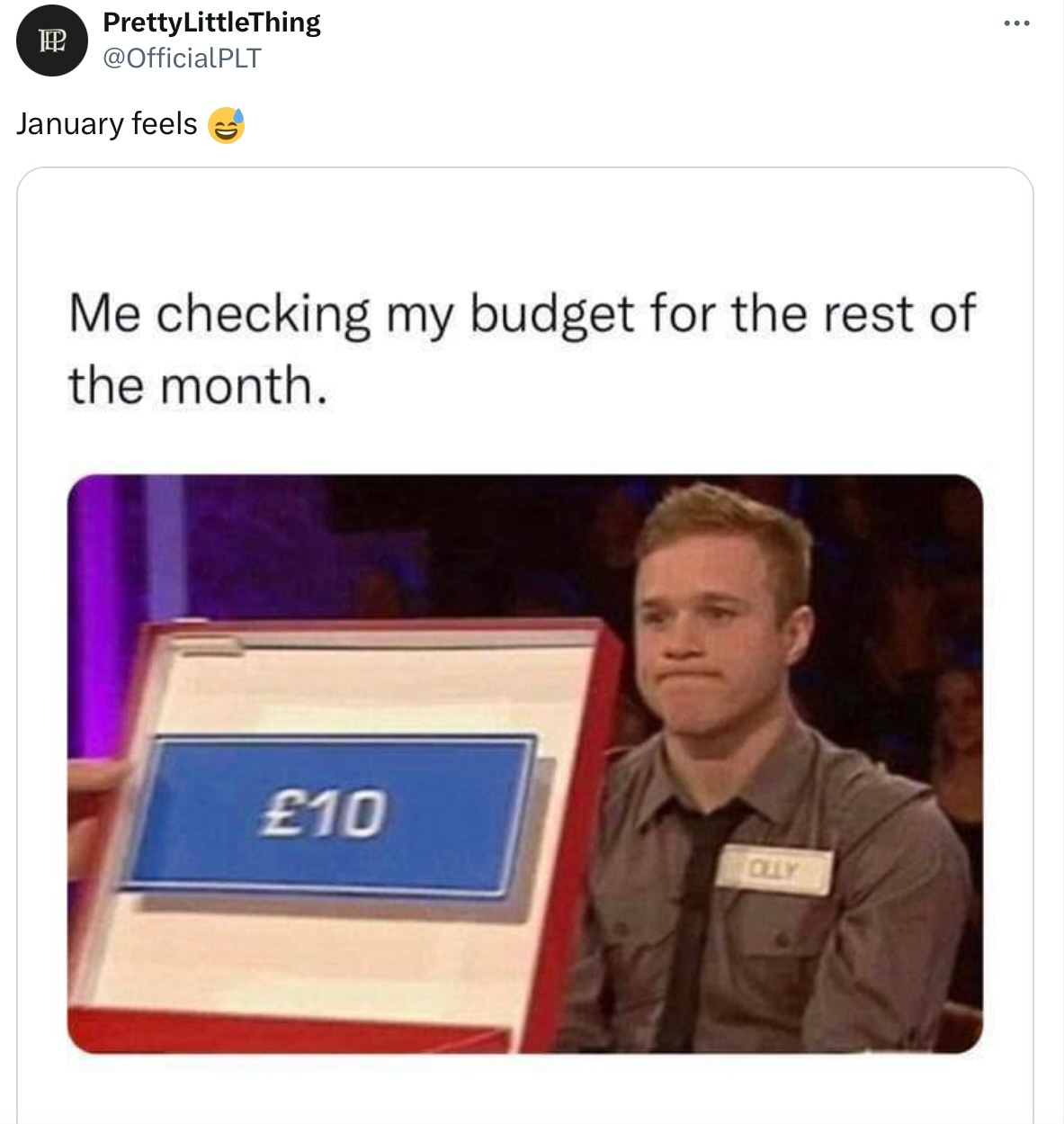 Poster girl PrettyLittleThing shared daily (stolen??) content that was only relatable to its customers, and not the women making its clothes. When I tracked a month of PLT’s tweets back in Jan 2021, I found a repetitive feed of aspirational quotes and struggle memes. Yes, PLT was really out here tweeting about having a £10 budget for the rest of the month in the same year they made £75.1 million in profits. £10 btw is three times the illegal hourly rate paid to their Leicester garment workers in 2018.