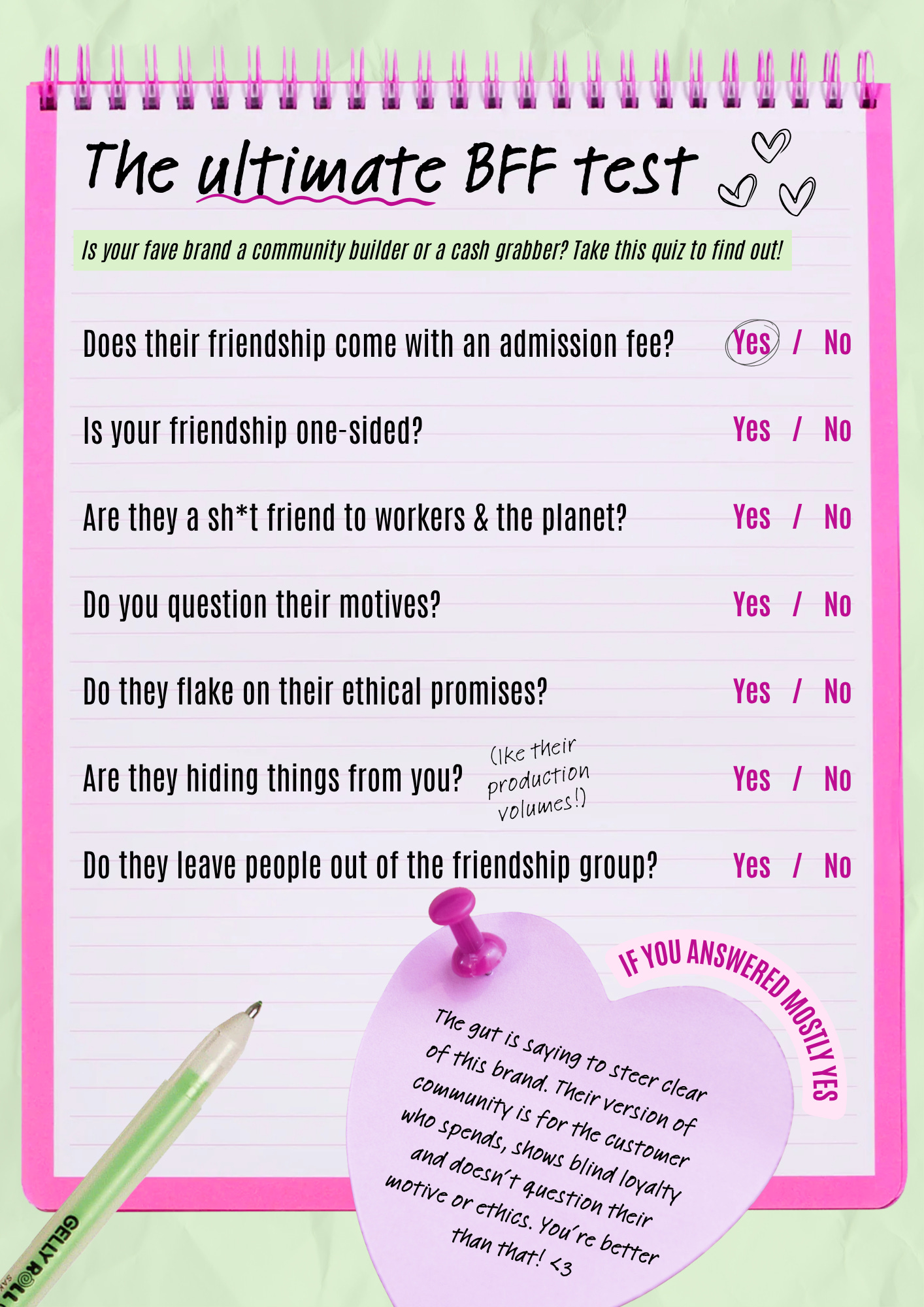💔 It’s one-sided: Brands want to act like our besties so we buy their recommendations and forgive them when they cross the line. But they’re not our friends or even human. They’re huge corporations whose sole purpose for existence is growth and profit. The rise of influencer brands has added a new parasocial layer to this. Silly team pranks, BTS footage and founder GRWM’s make it easier to buy into brands as people. Have you noticed how hard customers are batting for brands over on TikTok lately? It’s deffo a symptom of community marketing. (For more tea on influencers, check out pg 28-29 of the mag)