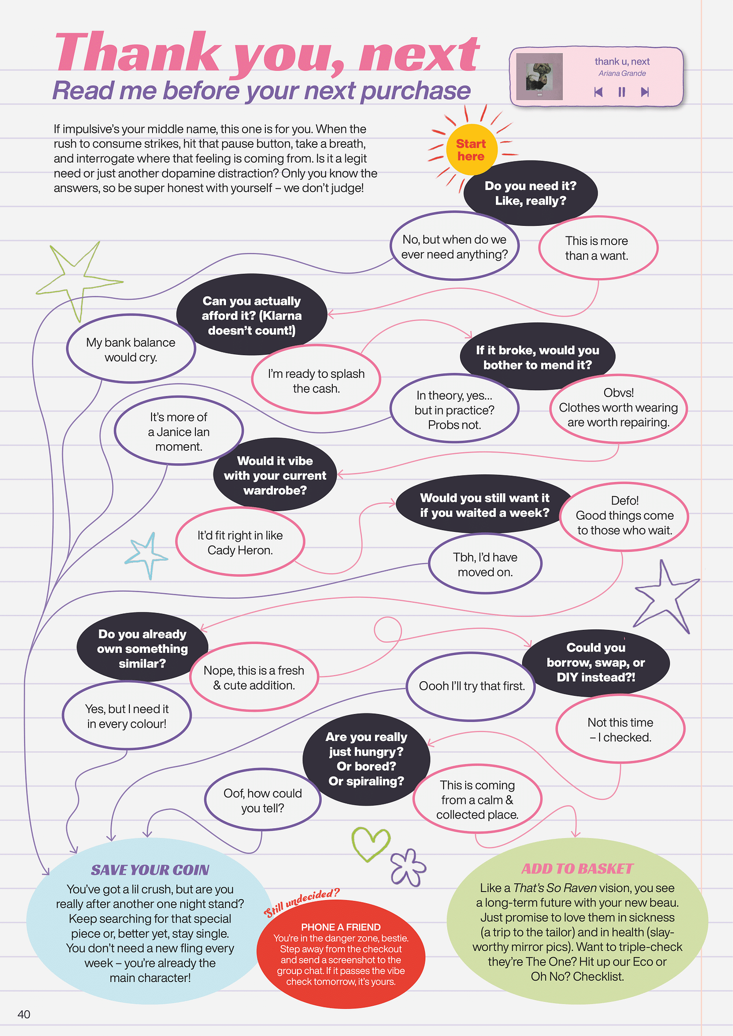 ➗ Reclaim girl math logic: Calculate the cost per wear to figure out if it’s really worth the financial and emotional investment. Or work out how many hours of your wages the price tag equates to. Ouch. And remember, it’s always 100% off if you don’t buy it!