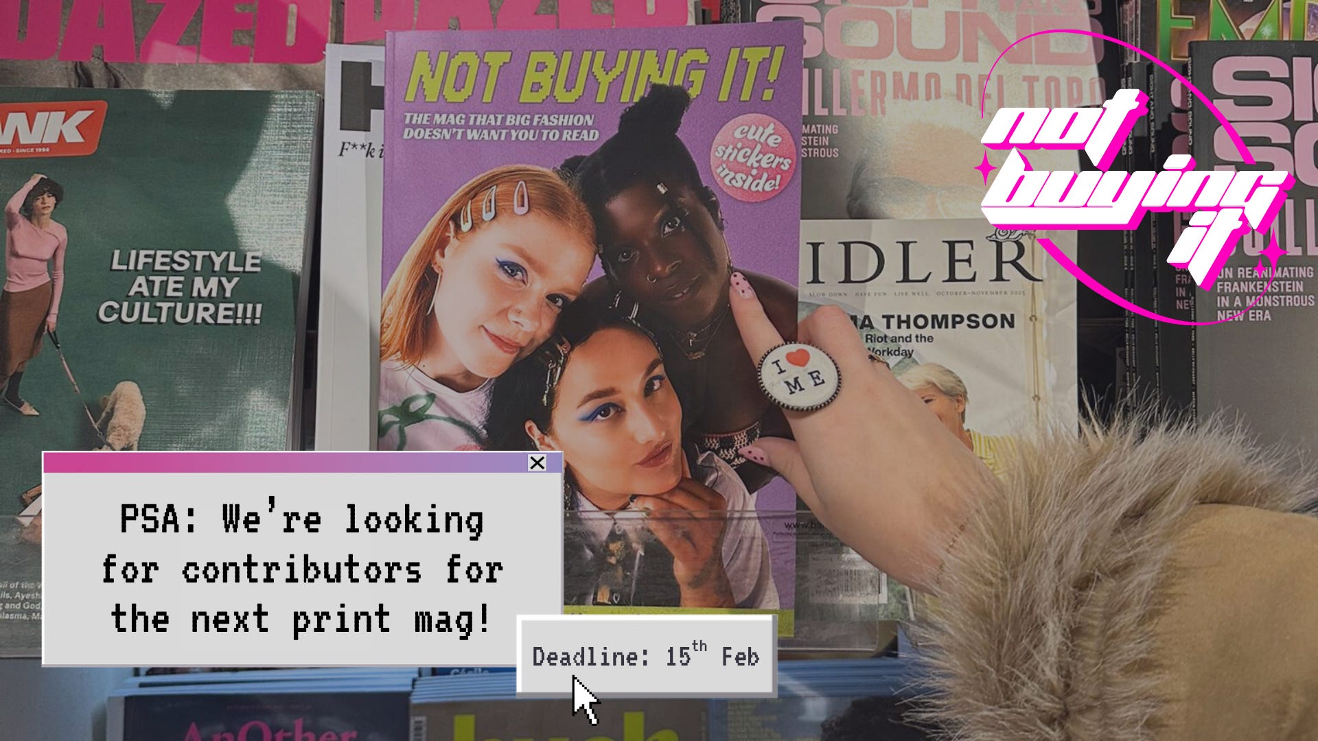 1) Pitch your idea: We’re looking for original writing, illustrations, collages, teen mag-style games and quizzes, photography, fashion designs and interviews that respond to the theme. To pitch, send us a short bio and 1-2 paras outlining your idea to mag@not-buying-it.co.uk.